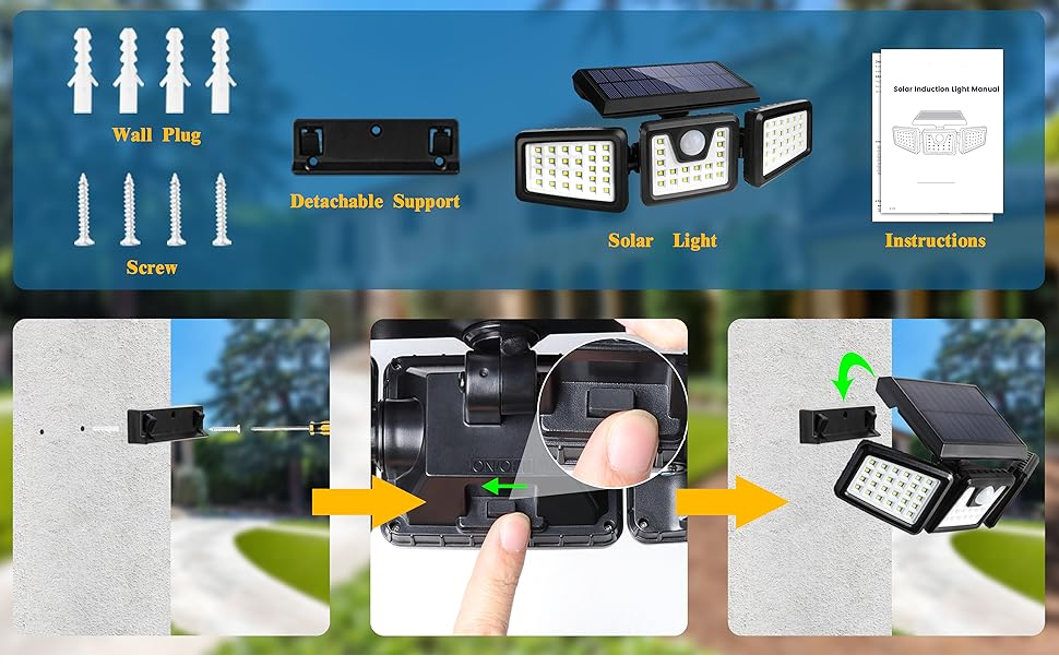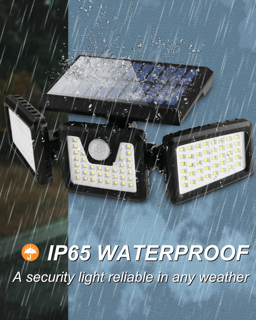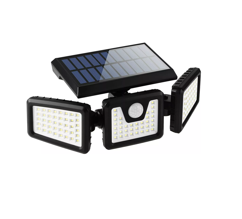 Brighten your outdoor spaces with the 3 Heads Motion Sensor Lights, featuring a wide-angle, three-head adjustable design and 74 ultra-bright SMD LEDs. With a sleek, modern appearance and compact 10.6-inch width, this solar-powered light emits a crisp daylight white (6500K) color temperature, ideal for patios, garages, gardens, and more. Built for durability, the light features a slim ABS+PC body, an IP65 waterproof rating, and advanced motion sensing — making it perfect for both residential and commercial outdoor applications.