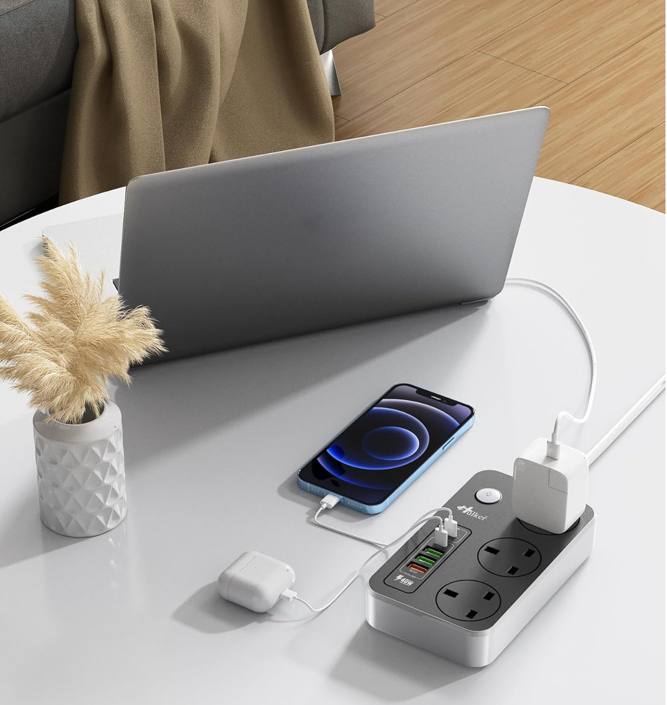 Upgrade your charging setup with this advanced 3-Way Extension Lead with USB-C and Fast Charge Ports. Designed for modern homes and offices, it features 3 UK plug outlets and 5 USB ports, including a 20W PD Type-C port and an 18W QC fast-charging port for rapid charging of smartphones, tablets, and laptops. The 2-metre heavy-duty cable provides flexibility for placement, while the 13A / 3250W capacity safely powers multiple devices simultaneously. Built-in surge and overload protection ensure your electronics are safe from sudden power surges. Compact, efficient, and stylish – this power strip keeps your workspace clutter-free and your devices fully charged.