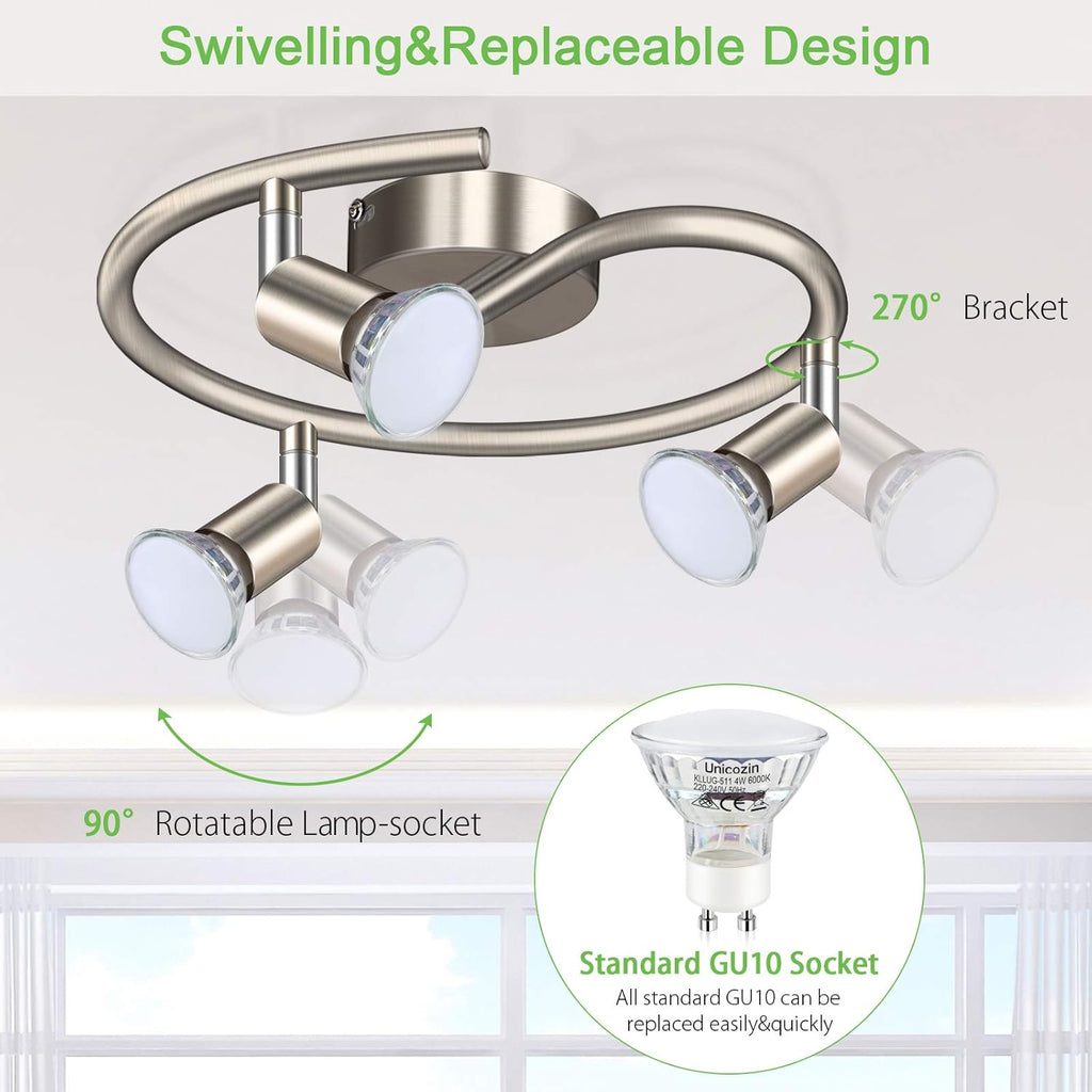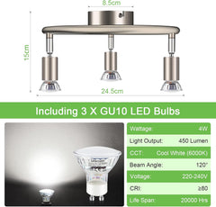 Upgrade your home lighting with this Rotatable 3-Way LED Ceiling Spotlight featuring a sleek matt nickel finish and adjustable swivel heads for targeted illumination. Designed with functionality and modern aesthetics in mind, this ceiling light is perfect for kitchens, living rooms, and bedrooms. The fixture includes three 4W GU10 LED bulbs, each offering 450 lumens of bright, cool white 6000K light, ideal for task or ambient lighting. The 3-way rotatable design lets you direct light exactly where needed, creating a dynamic and flexible lighting experience. Energy-efficient, stylish, and easy to install, this LED ceiling spotlight is a must-have for modern homes.
