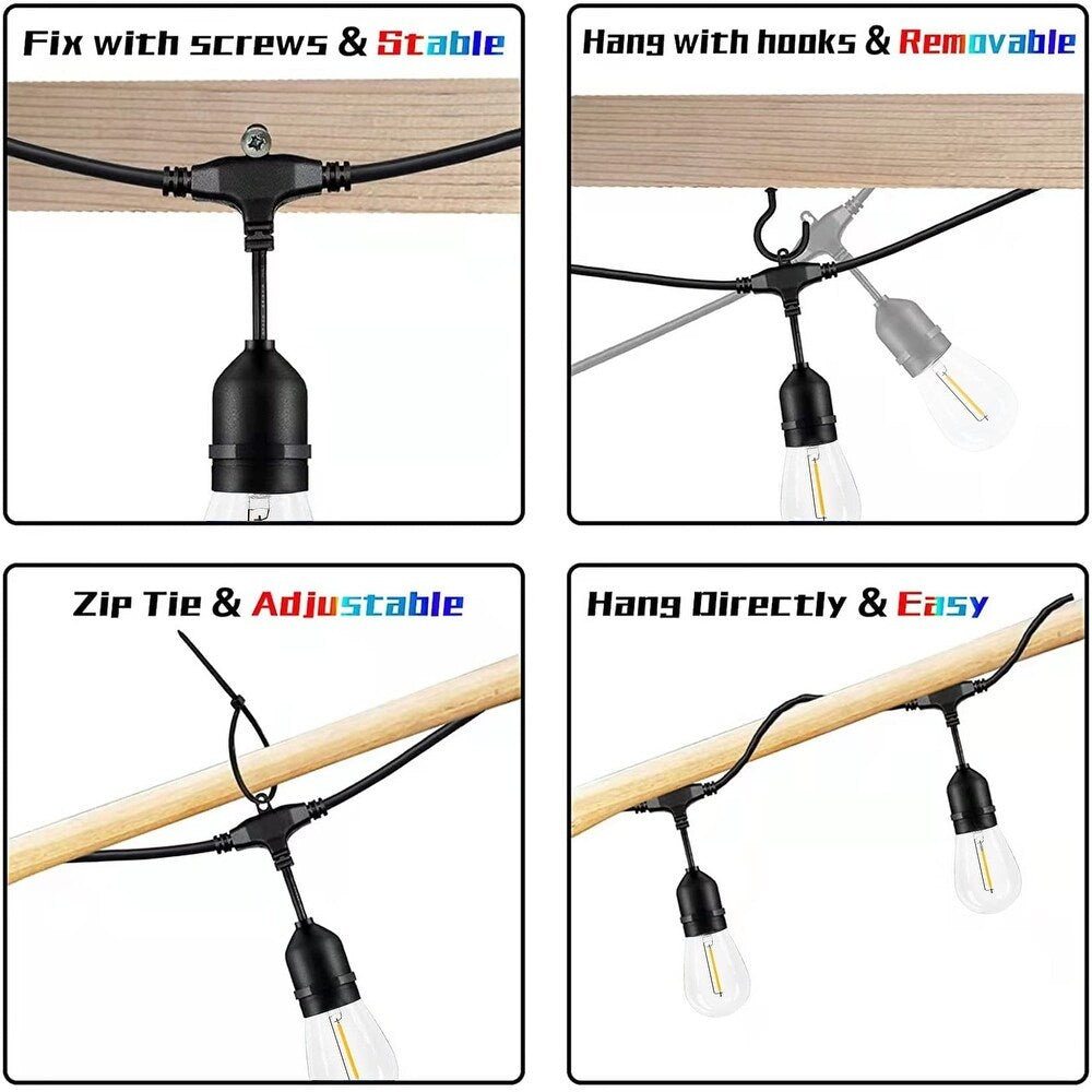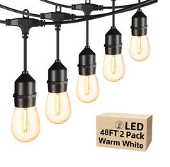 • Ambience String Lights Outdoor】48ft in total, 1 x48ft. This hanging light string with 2700K led plastic bulb emits a soft warm glow, creating a comfortable and cozy ambience in your backyard, garden, gazebos, balcony, party.
