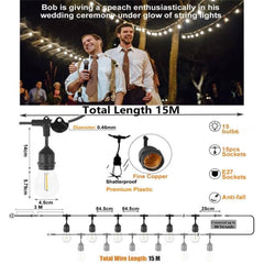 48FT Outdoor LED String Lights, S14 Festoon Lights with 15 E27 Sockets, IP65 Waterproof, 2700K Warm White for Garden, Patio, Party