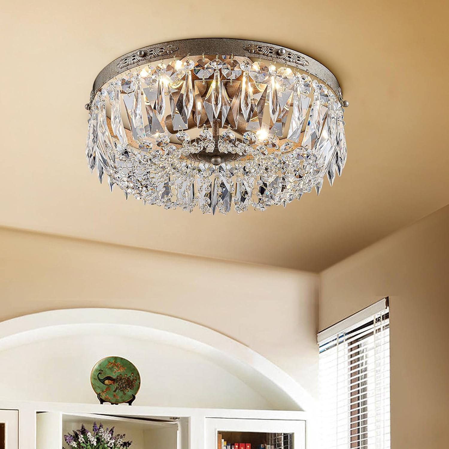 Elevate your interiors with the Antique Silver French Empire Crystal Semi Flush Mount Chandelier, a stunning blend of classic elegance and modern functionality. Designed to captivate, this semi-flush ceiling light features glistening crystals cascading from an antique silver frame, perfect for adding luxurious ambiance to your dining room, bathroom, bedroom, or living room. The timeless French Empire design complements both traditional and contemporary decor styles, while the compatibility with energy-efficient LED bulbs ensures long-lasting brilliance. Easy to install and requiring 4 E14 bulbs, this chandelier is more than just a light—it's a statement piece that transforms any room with style and charm.