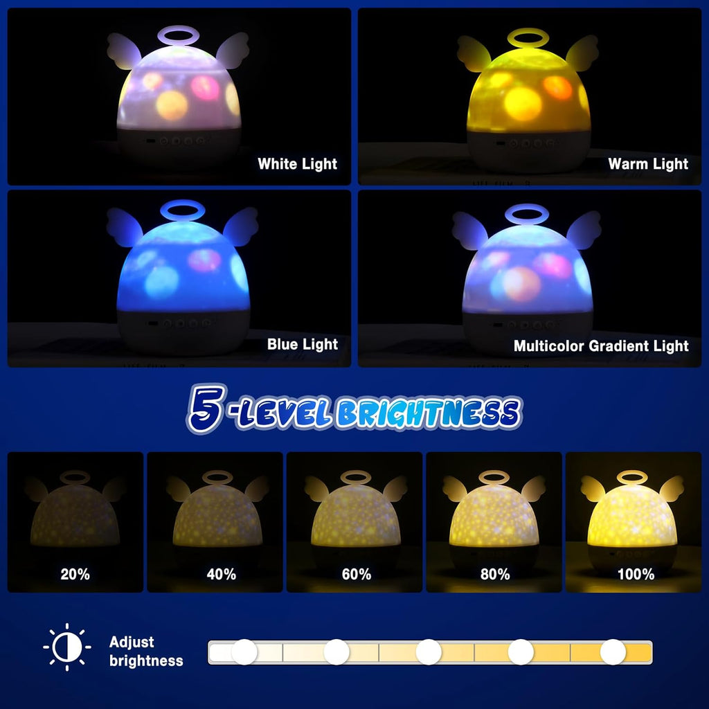 Whether it's time for bed, a cozy afternoon nap, or a calming break during playtime, this projector’s four gentle light colors and five adjustable brightness settings help create the perfect soothing atmosphere. With 20 built-in lullabies, it serves as a sleep companion, gently easing children into relaxation with soft melodies.