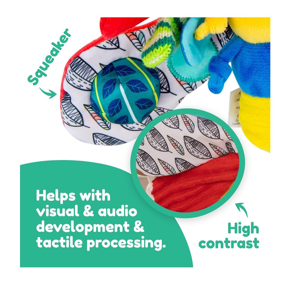 Multi-Sensory Design – Bright colors, crinkly textures, jingles, and a mirror stimulate sight, touch, and sound.