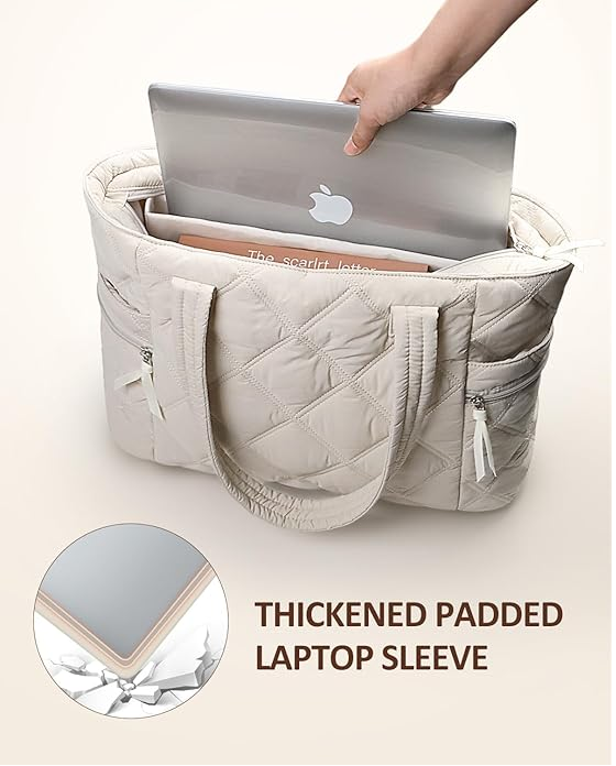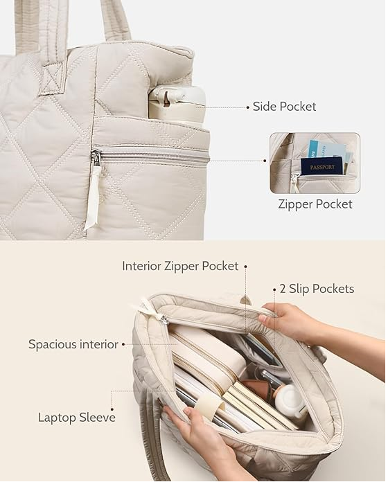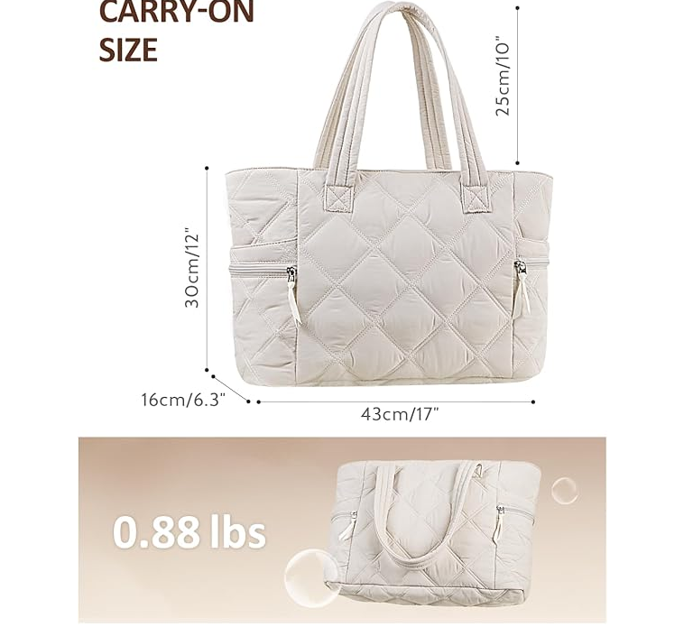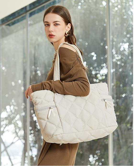 This Large Puffer Tote Bag for Women combines comfort, style, and practicality. Crafted from lightweight, water-resistant puffer fabric, it offers a soft, fluffy texture with a modern quilted design. The spacious interior easily accommodates laptops, books, gym clothes, or daily essentials, making it perfect for teachers, nurses, students, and professionals. Featuring strong shoulder straps, secure zippered closure, and multiple pockets, this tote ensures everything stays organized on the go. Ideal for work, school, gym, travel, or everyday use, this bag is the perfect mix of fashion and function.