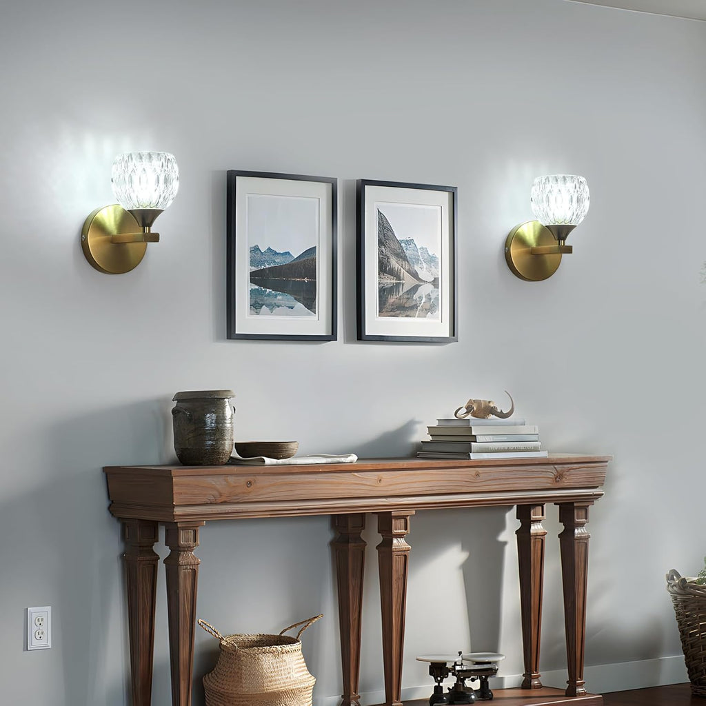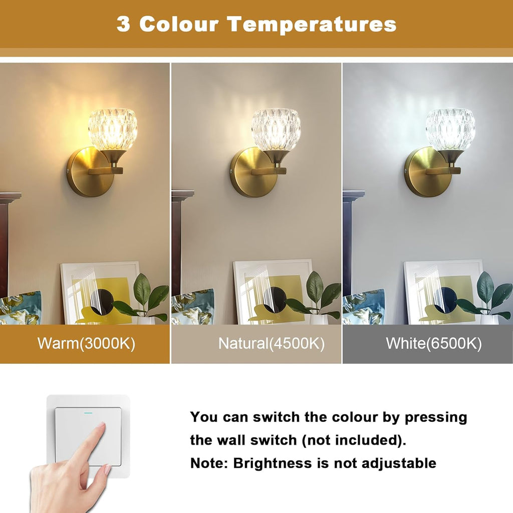 This gold wall sconce comes with a G9 bulb that supports three color temperatures (3000K / 4500K / 6500K) — allowing you to switch between warm, neutral, and cool white light to perfectly match your mood or room setting. Whether you need cozy lighting for your bedroom, bright illumination for your corridor, or ambient light for your living room or staircase, this fixture provides a versatile and eye-catching solution.