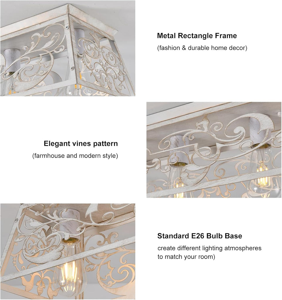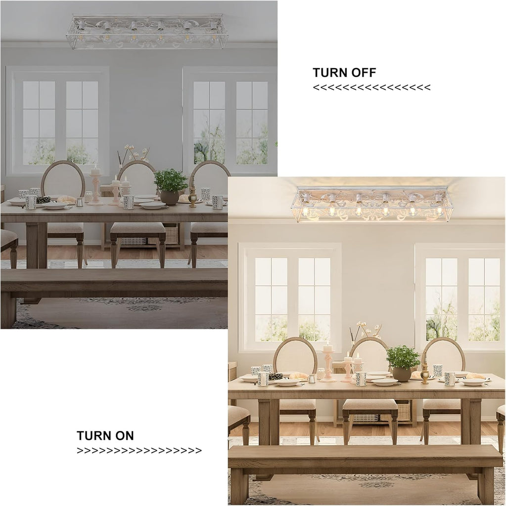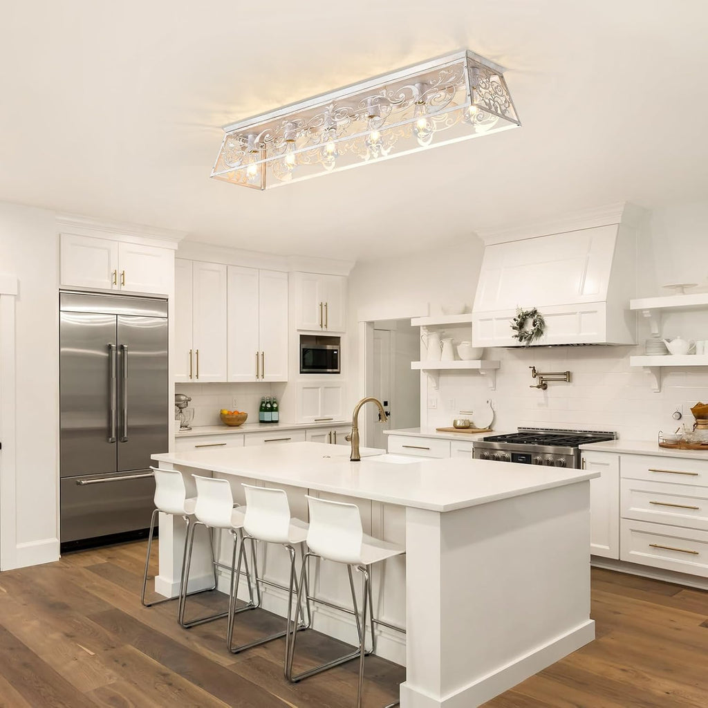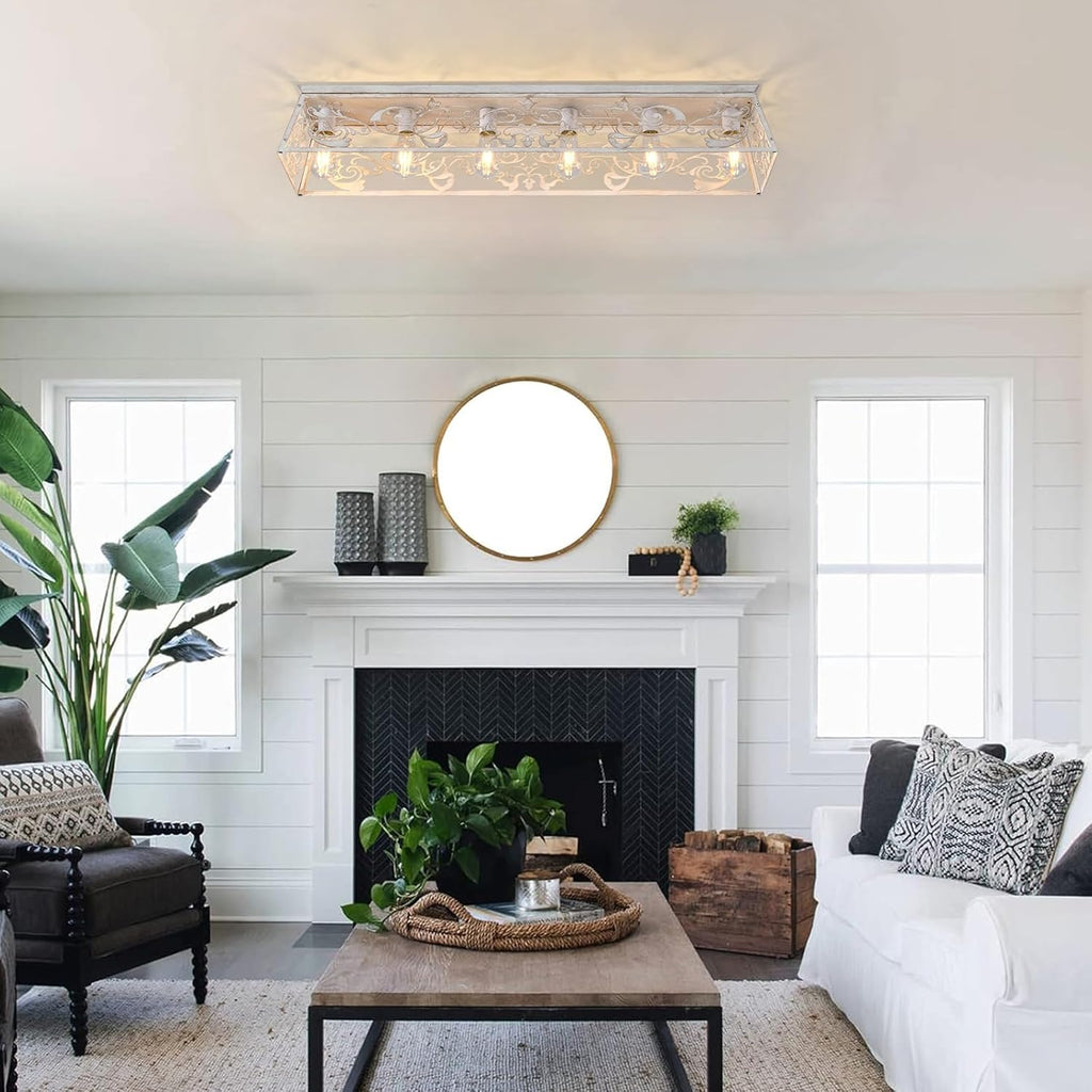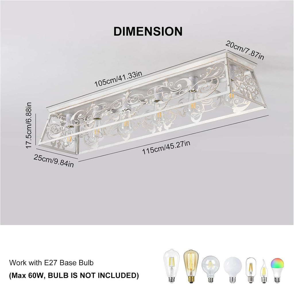 Our Modern Rectangle Ceiling Light is a striking blend of farmhouse, industrial, and contemporary design. Crafted from high-quality iron with a white and gold painted finish, this 6-light chandelier features a unique rectangular frame with elegant lacelike patterns that enhance any space. Measuring 115cm in length, it is perfect for illuminating larger areas such as kitchen islands, dining rooms, or living spaces. Designed with 6 E27 sockets, this fixture is fully compatible with LED, incandescent, and halogen bulbs up to 60W each, and can be dimmed with the right bulbs and switch for tailored ambiance. Durable, stylish, and versatile, this ceiling light is an ideal choice for homes seeking both functionality and modern sophistication.