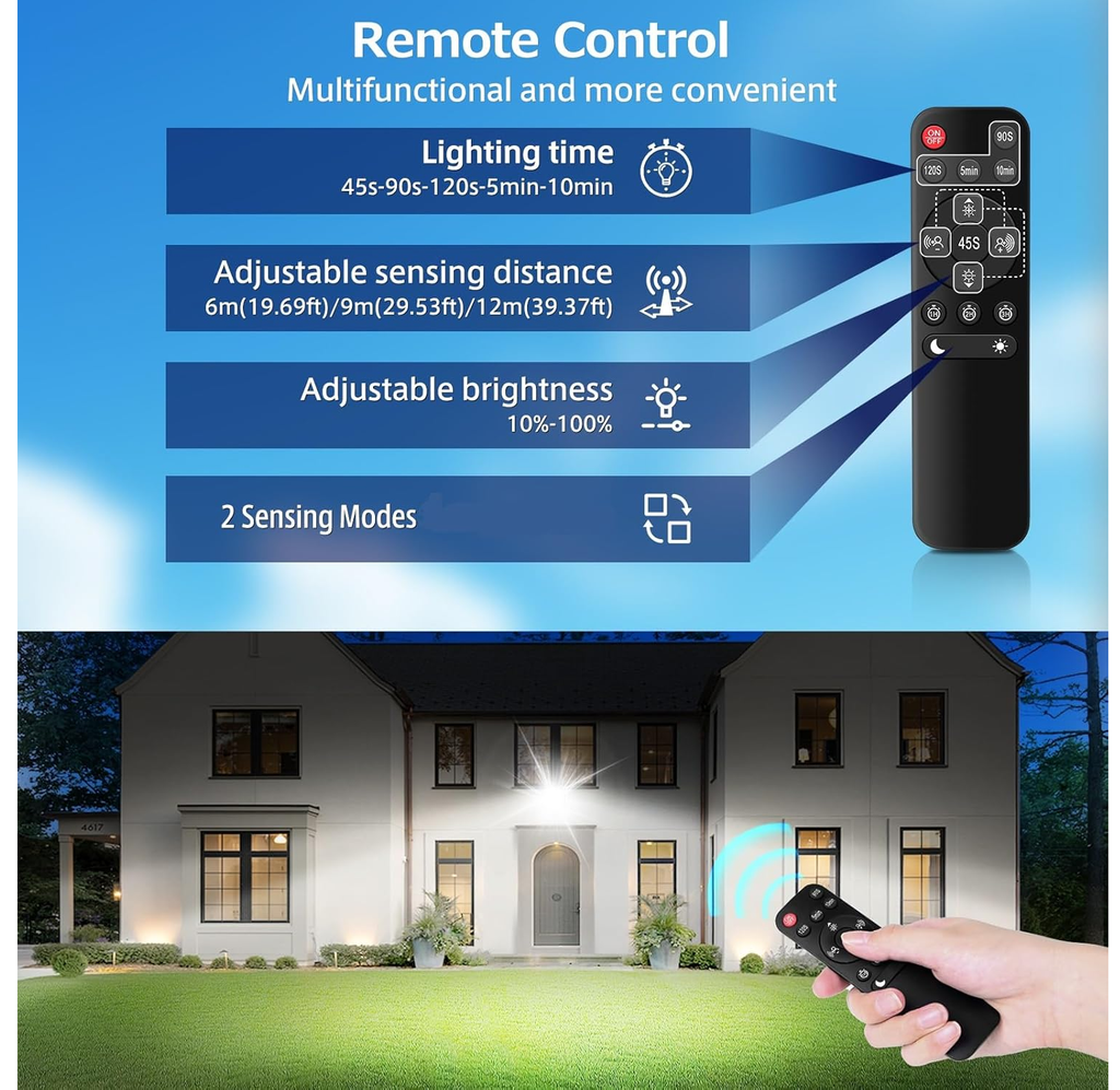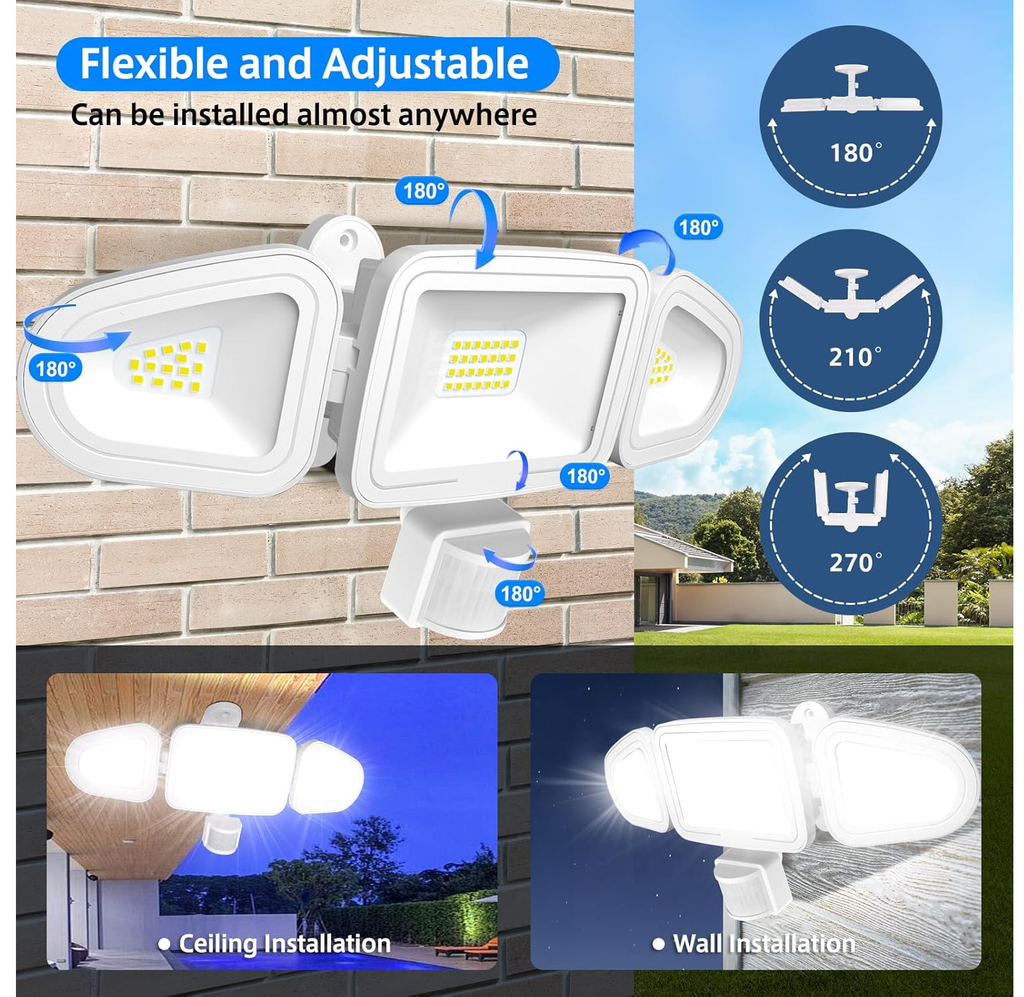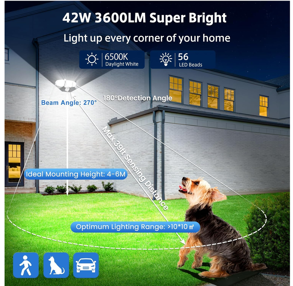 The 42W Motion Sensor Security Light features three adjustable heads and a remote for total lighting control. With 3600 lumens and a 180° sensing angle, it ensures wide-area illumination. Its IP66 waterproof rating makes it suitable for outdoor installation on walls, ceilings, or poles.