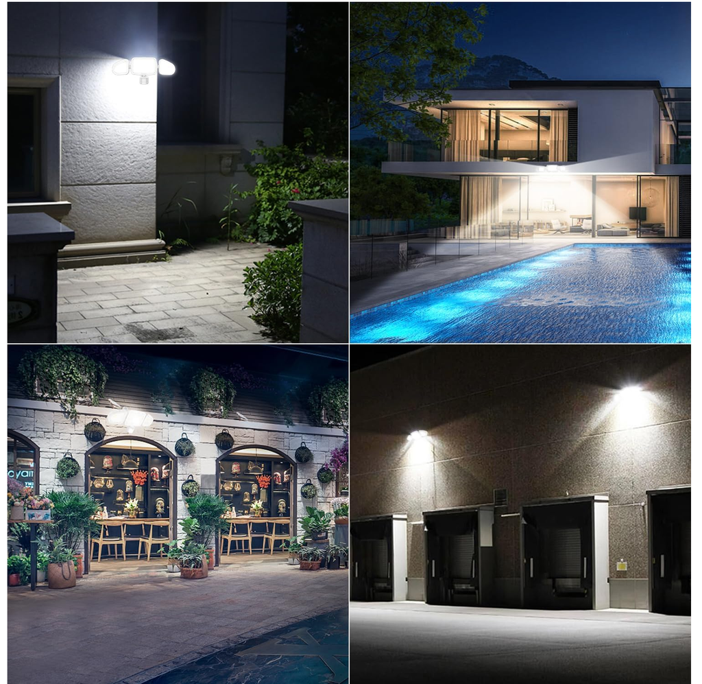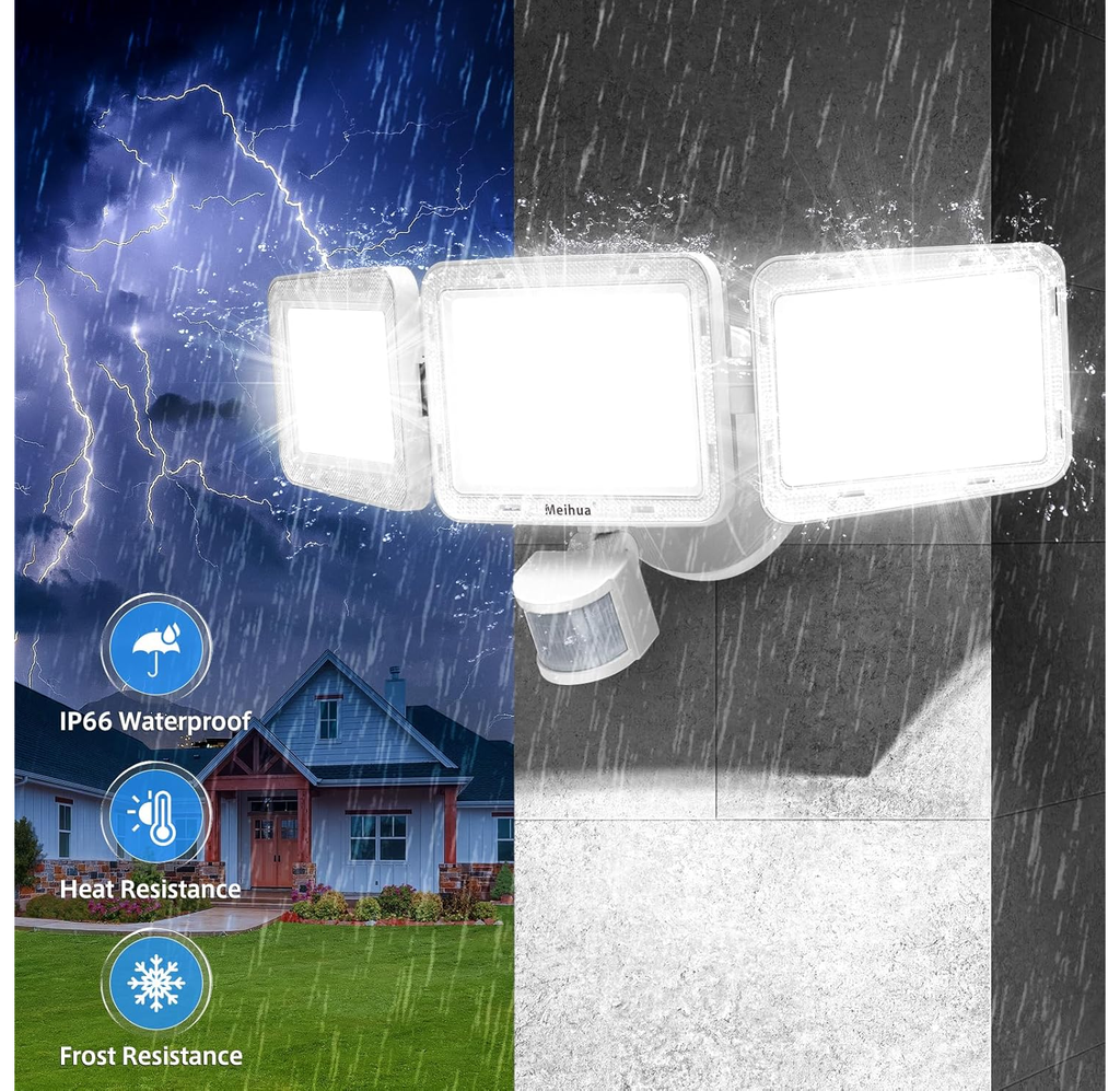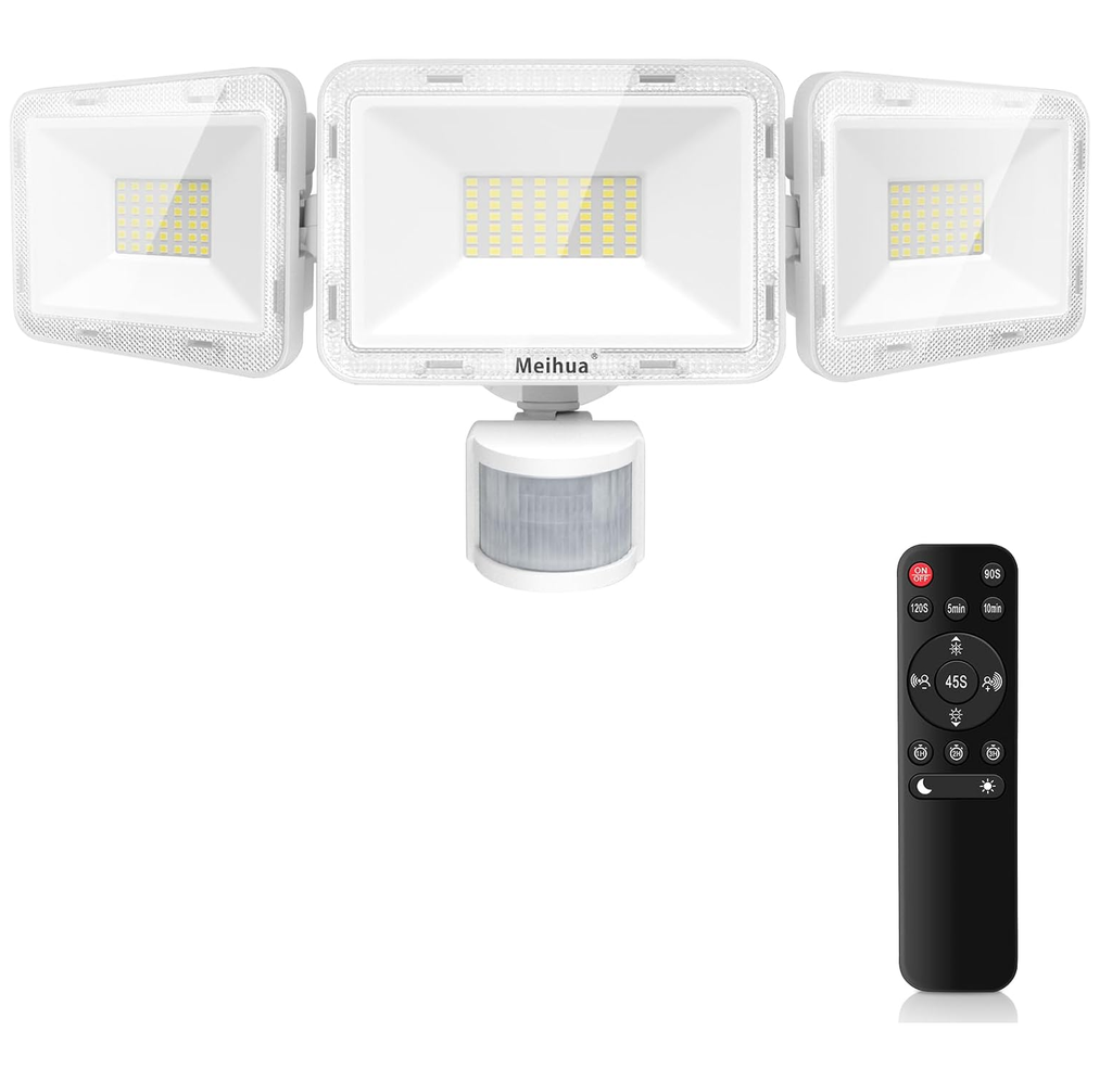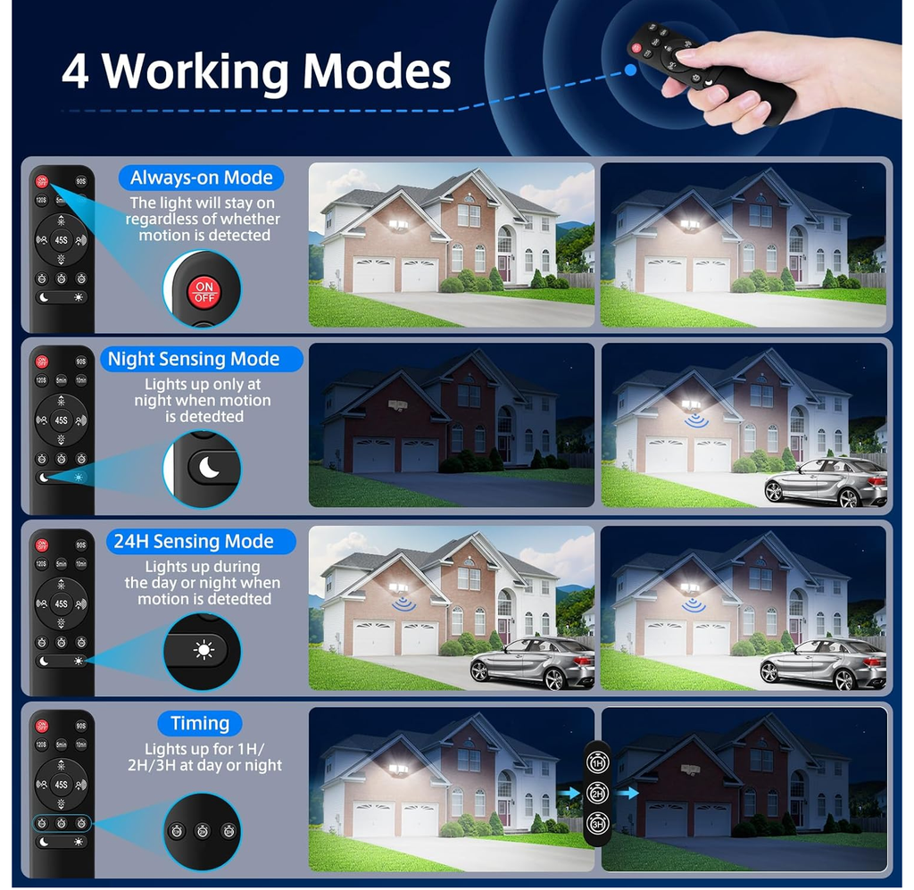 The 42W Motion Sensor Security Light features three adjustable heads and a remote for total lighting control. With 3600 lumens and a 180° sensing angle, it ensures wide-area illumination. Its IP66 waterproof rating makes it suitable for outdoor installation on walls, ceilings, or poles.