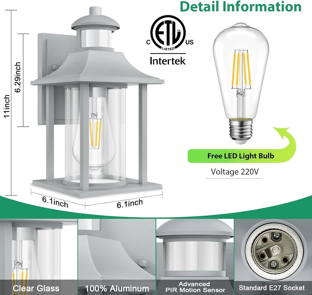 Illuminate your outdoor space with this sleek grey motion sensor wall light, designed for security, durability, and energy efficiency. Made with weather-resistant aluminum and seeded glass, it offers 3 intelligent lighting modes, adjustable motion sensitivity, and includes a free incandescent bulb. Perfect for doorways, gardens, porches, and walkways—enhancing your home's safety and curb appeal.