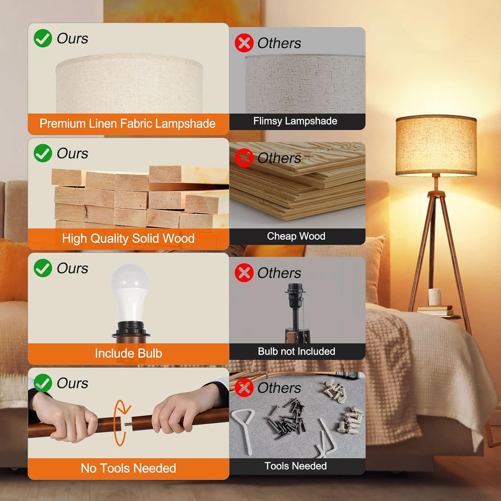 Elevate your home’s ambiance with this Solid Wooden Tripod Floor Lamp, a perfect blend of style, functionality, and modern convenience. Crafted from natural rubber wood with a durable beige lampshade, this standing lamp offers a timeless, mid-century aesthetic that complements any décor — from minimalist and modern to farmhouse or industrial styles.