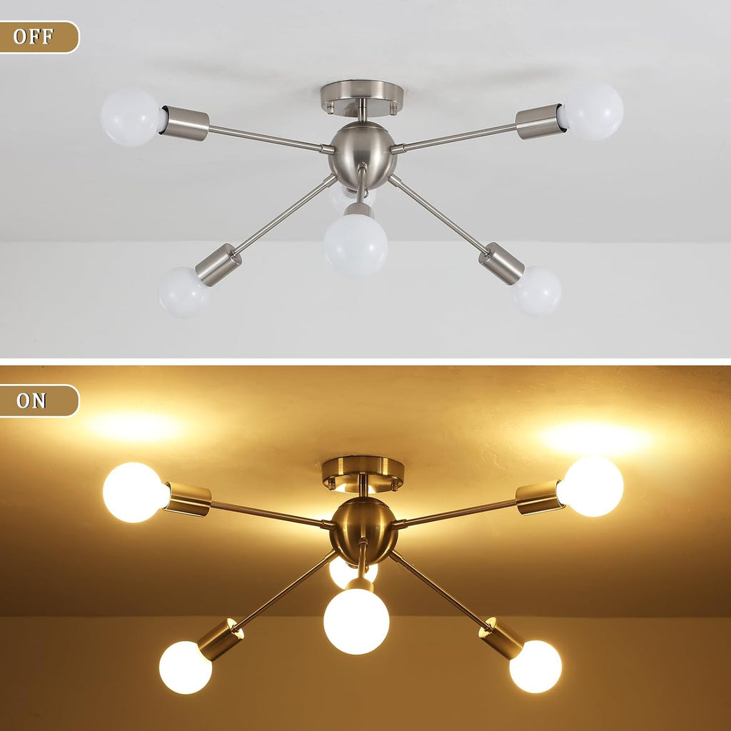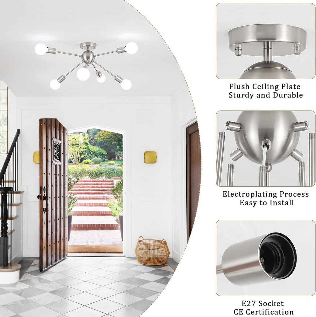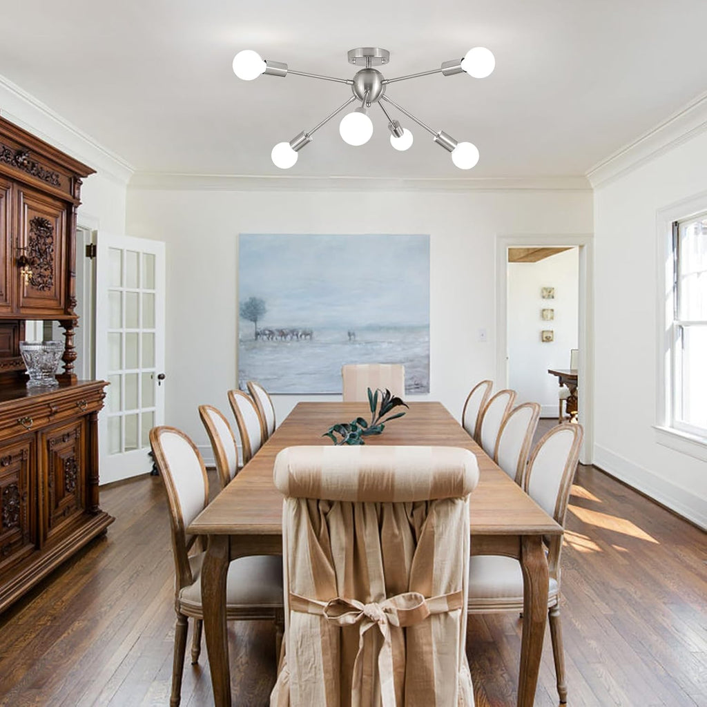 Our 6-light Sputnik ceiling light combines mid-century modern design with industrial style, making it a striking centerpiece for any home. Crafted from high-quality electroplated metal, this fixture is durable, rust-resistant, and built to last. Its chrome finish adds elegance, while the six adjustable arms provide bright, evenly distributed illumination across living rooms, bedrooms, kitchens, dining rooms, or hallways. Compatible with E27 bulbs (LED, Edison, CFL, halogen, or incandescent, max 60W each), this chandelier is also dimmable when paired with dimmable bulbs and a compatible dimmer switch (not included). Measuring 62.5 cm in length and 22.5 cm in height, it fits beautifully in both modern and transitional interiors. Easy to assemble with included hardware, this semi-flush mount light delivers both functionality and timeless design.