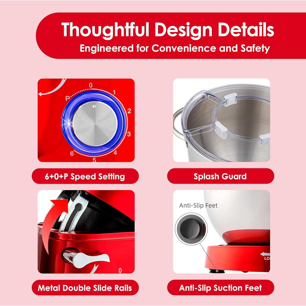 Our 6.2L Stand Mixer is a powerful and versatile kitchen companion designed to make baking and cooking effortless. Featuring a robust 1400W motor and tilt-head design, this mixer ensures thorough mixing for a wide range of recipes—from bread dough and cake batter to whipped cream and meringue. The large stainless steel bowl provides ample space for family-sized portions, while the sleek red finish with a durable 2-layer coating adds a modern touch to your kitchen. With included dough hook, wire whip, and flat beater, this stand mixer offers performance and style in one.