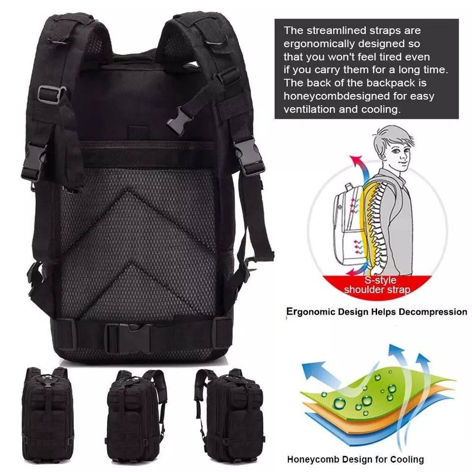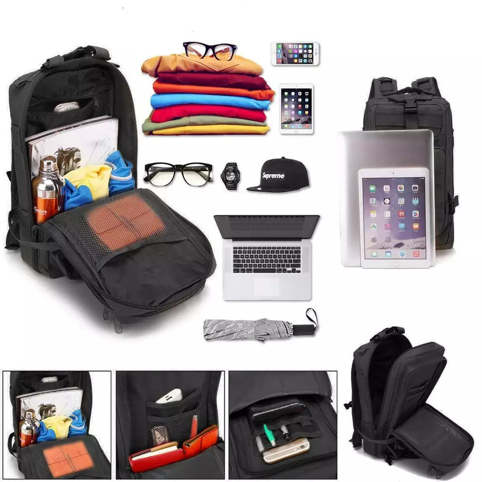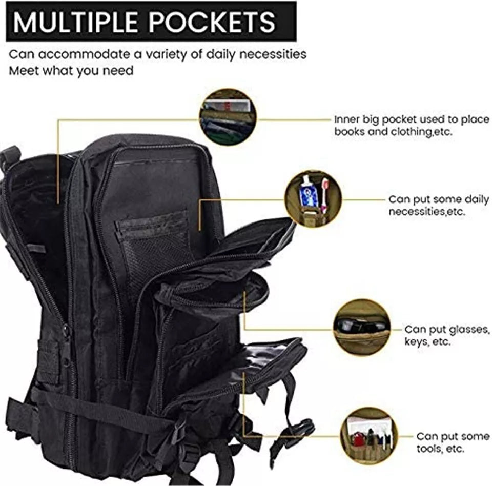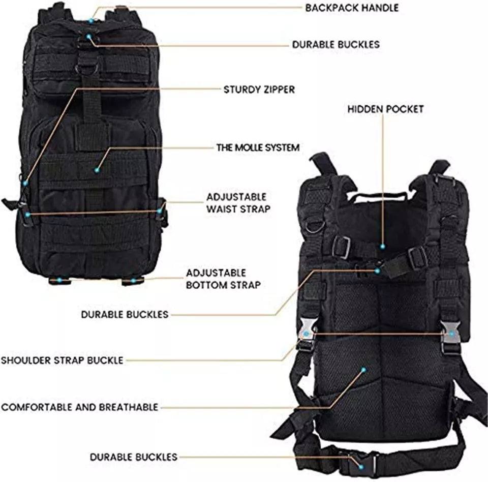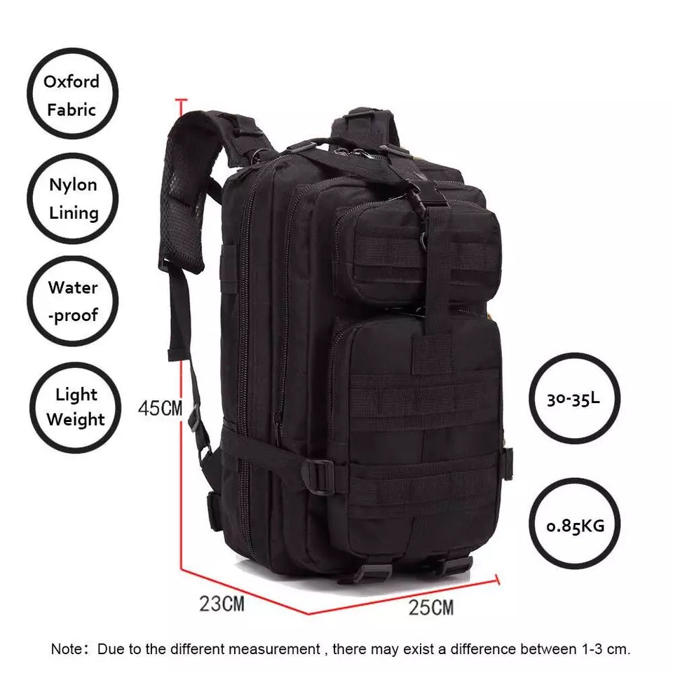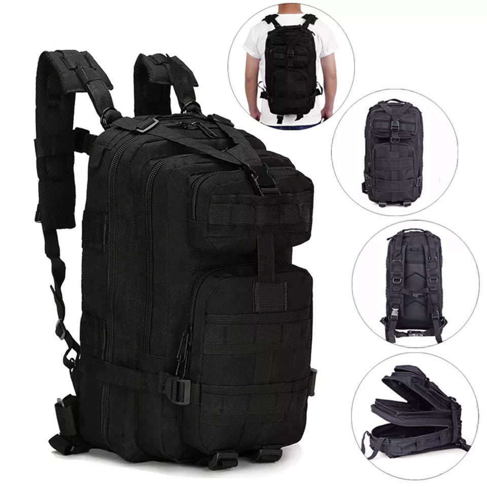 The 30L Military Tactical Backpack is a durable army rucksack designed for camping, hiking, trekking, and outdoor adventures. Made from high-quality, wear-resistant materials, this heavy-duty backpack offers ample storage space with multiple compartments for organizing gear, tools, and essentials. Featuring a zippered closure, adjustable straps, and a hidden compartment, it ensures secure and comfortable carrying for long journeys. Whether you're on a hiking trip, military mission, or survival expedition, this rugged tactical rucksack provides reliable performance, durability, and versatility for all your outdoor needs.